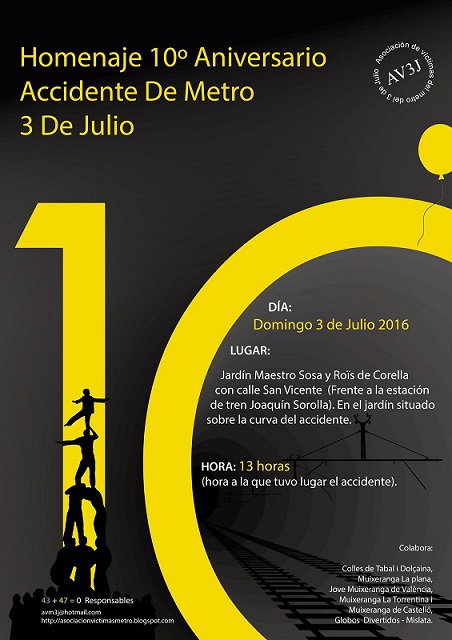 Entre las conclusiones se señala también la falta de interés del Consell y de FGV por esclarecer las causas del accidente y "el menosprecio" al que los gobiernos del PP han sometido a la Asociación de Víctimas del Metro 3 de julio (AVMJ) en estos diez años.